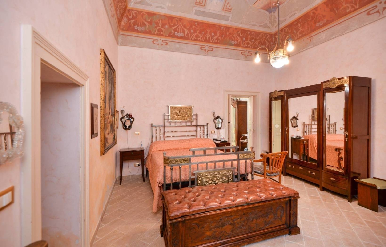 The main building, measuring approximately 367 sqm, hosts an elegant residence comprising an entrance hall, a kitchen created within an ancient fireplace, a living room, a sitting room with a stone fireplace, two bedrooms, and two bathrooms. On the upper floor, there is a third bedroom with bathroom and access to the rooftop terrace, offering open views over the garden and the historic center. The interiors are enhanced by barrel vaults, star-shaped vaults, and frescoed ceilings, adding charm and authenticity.