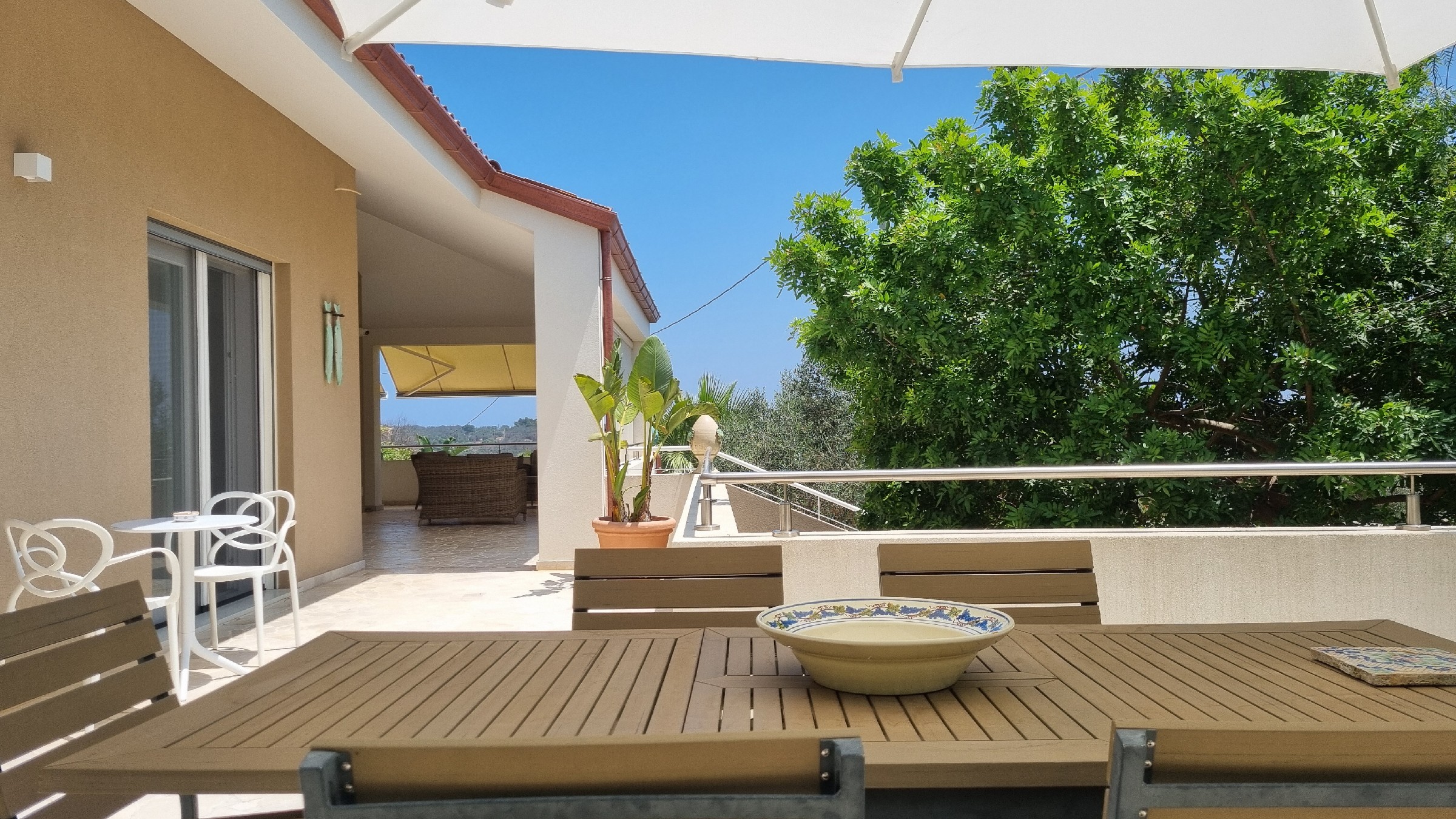The living area is particularly welcoming, with a spacious lounge connecting to the dining room and a custom-made kitchen with an island. The living space is surrounded by verandas with sea views, equipped to enjoy outdoor living all year round. The villa includes three double bedrooms and two large bathrooms, as well as an adjoining laundry and ironing room.