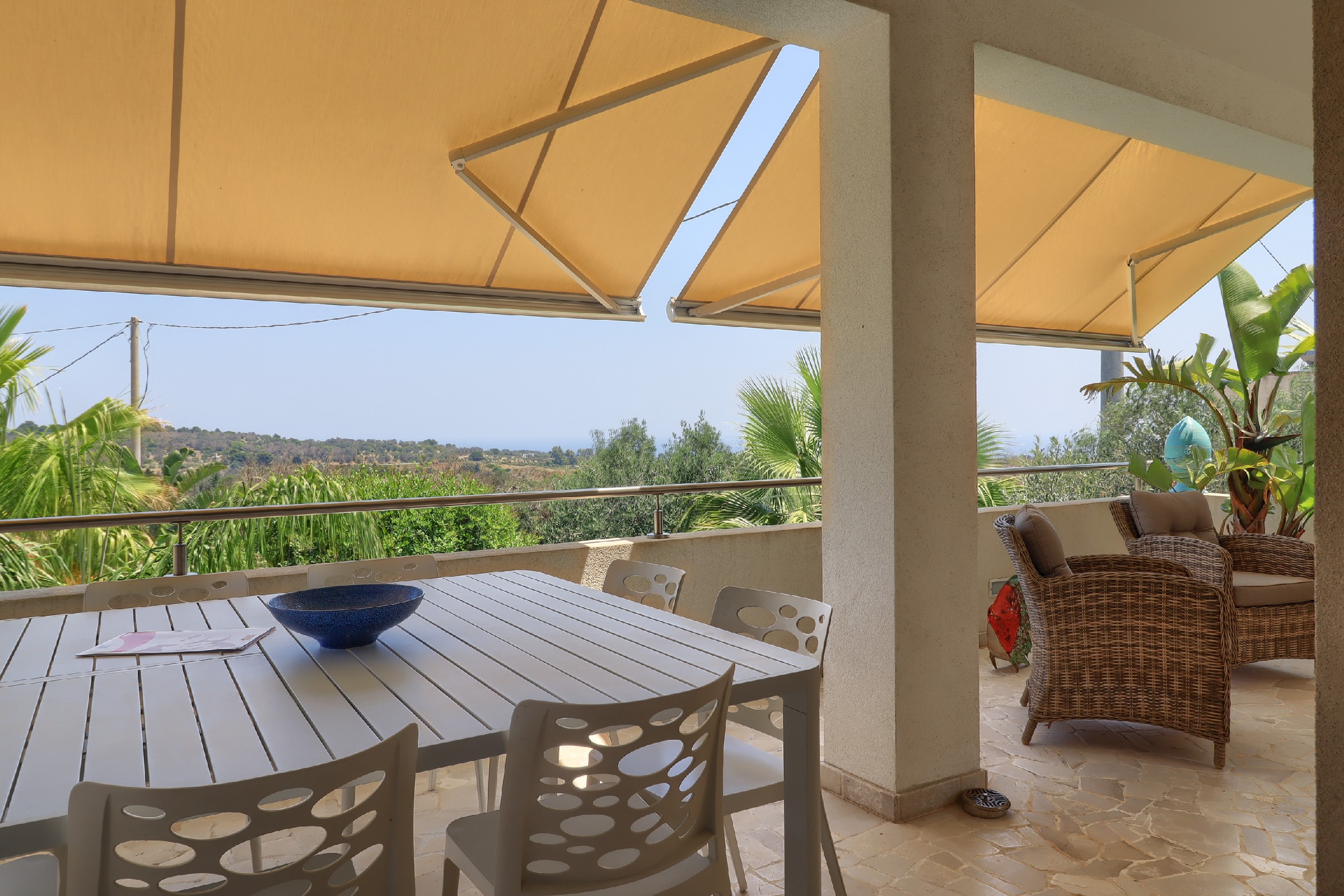 La zona giorno è particolarmente accogliente, con un ampio salotto che si collega alla sala da pranzo e a una cucina su misura con penisola. La zona giorno è circondata da verande con vista mare, attrezzate per godere dello spazio esterno tutto l’anno. La villa dispone di tre camere da letto matrimoniali e due grandi bagni, oltre a una lavanderia-stireria adiacente.