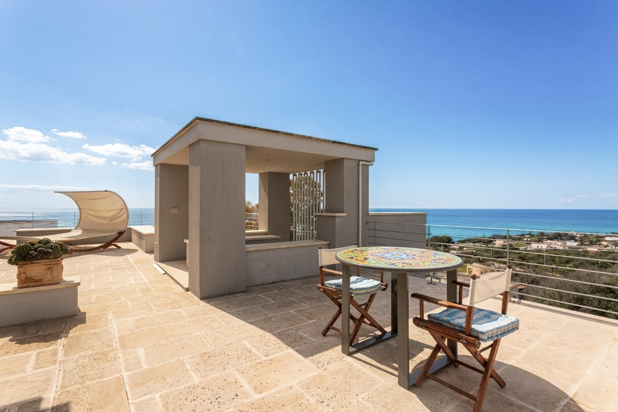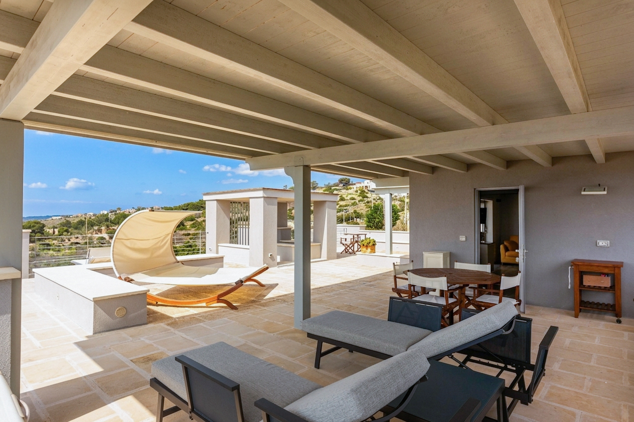 Il livello superiore rappresenta uno degli elementi più distintivi della villa: un ampio terrazzo panoramico vista mare, in parte coperto e perfettamente attrezzato per vivere all’aperto. Qui trovano spazio una zona relax ombreggiata, una doccia esterna e un vano tecnico rifinito. Da questo punto privilegiato si gode di un panorama aperto e suggestivo, che rende questo ambiente uno dei più rappresentativi e scenografici dell’intera proprietà.