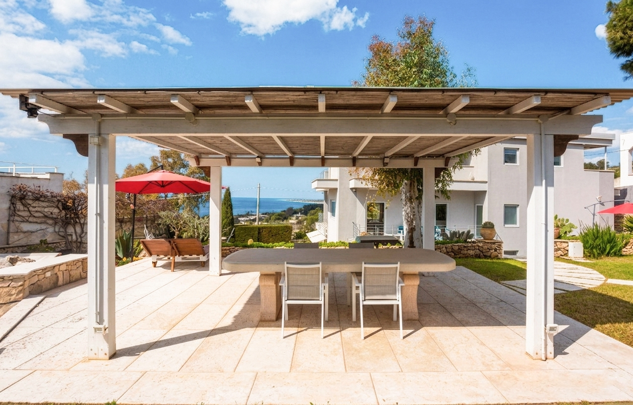 Gli spazi esterni sono stati progettati per vivere appieno la casa: pergole attrezzate con zona pranzo e area relax, ampie superfici solarium e angoli ombreggiati si alternano in modo armonioso.