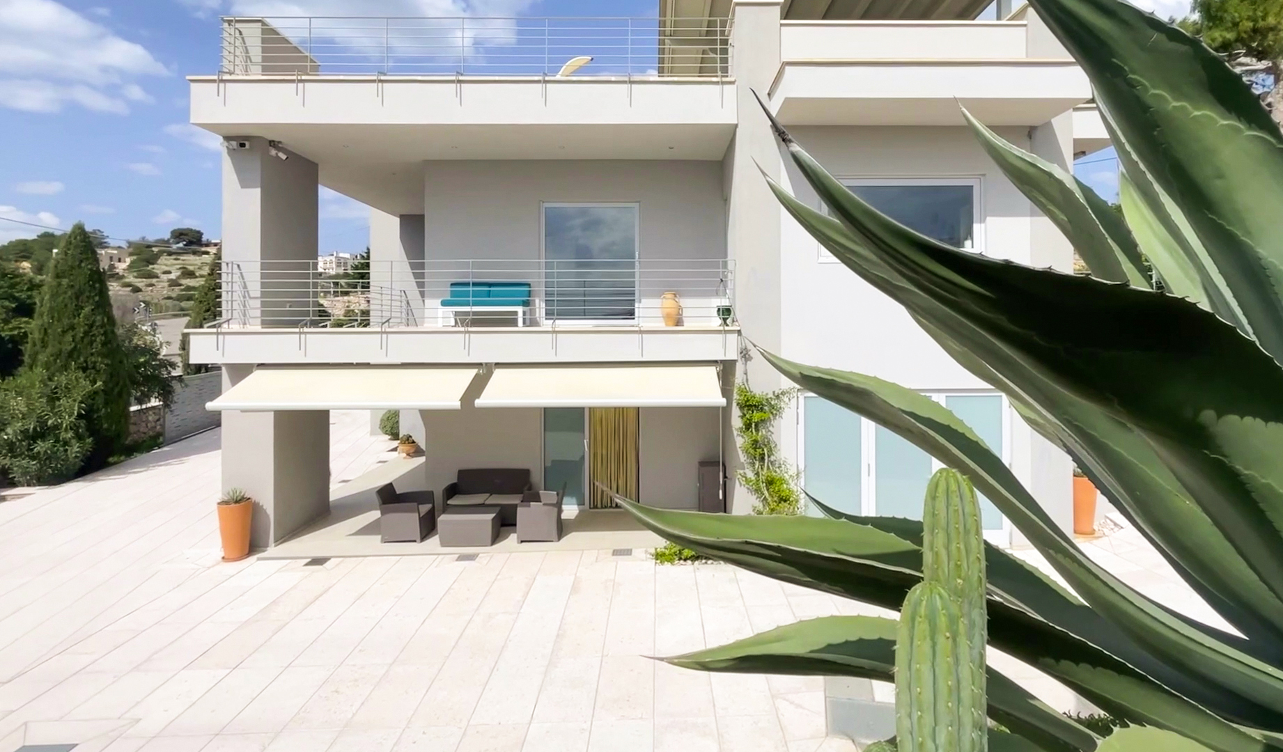 Gli spazi interni sono arricchiti da numerose aree esterne: due portici, tre terrazzi al piano primo e uno straordinario terrazzo panoramico al piano superiore di circa 130 mq, in parte coperto. Completano la proprietà ampie superfici pavimentate, pergole attrezzate per la vita all’aperto e un curato giardino terrazzato con essenze ornamentali, che valorizzano ulteriormente il contesto.