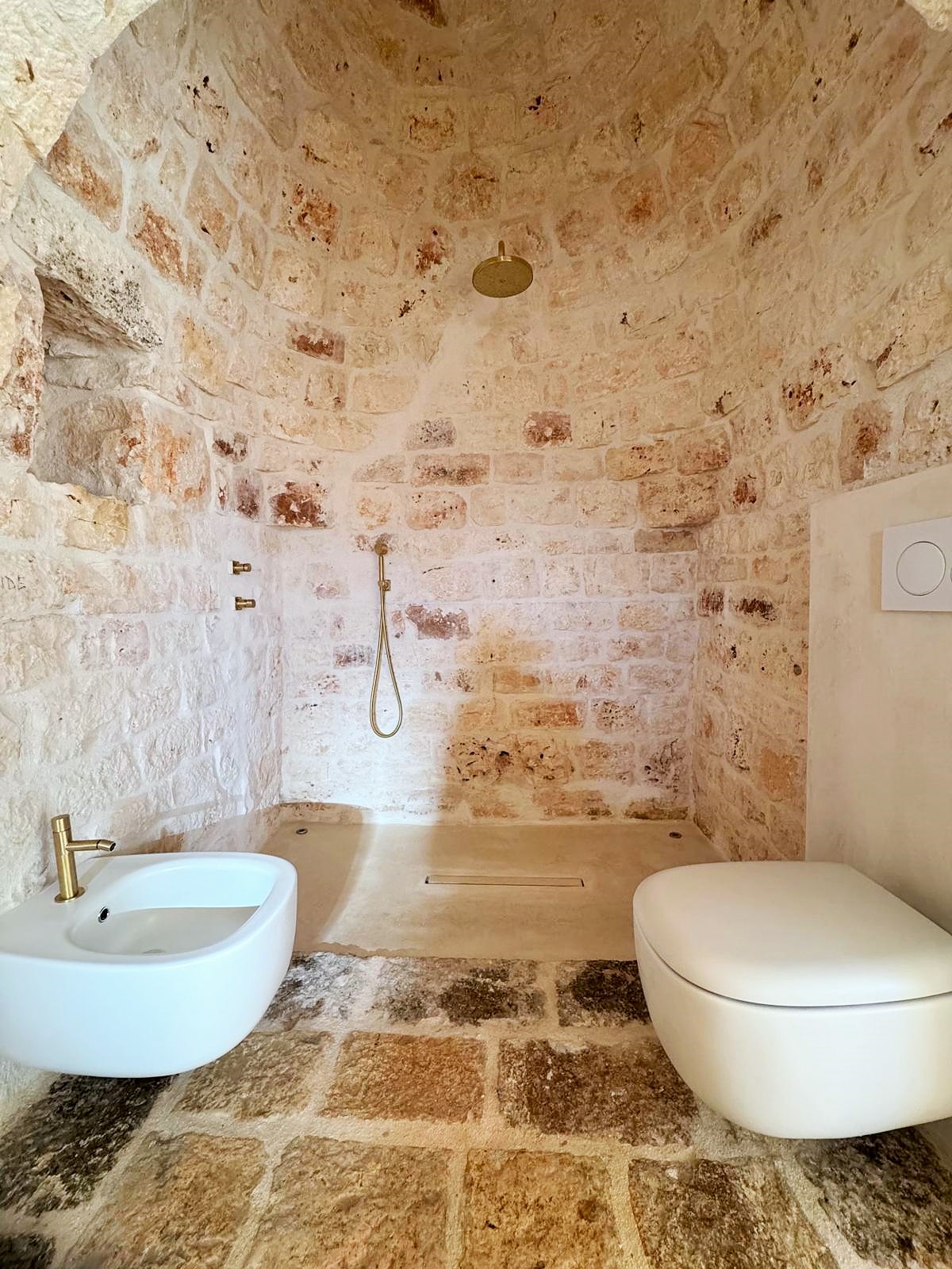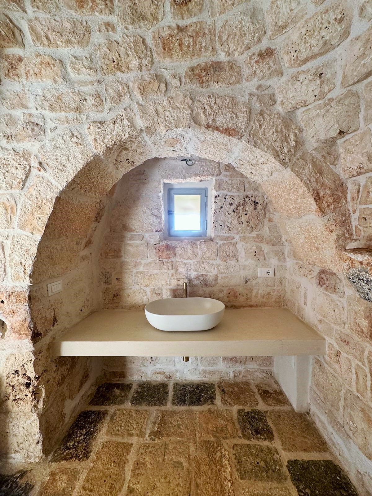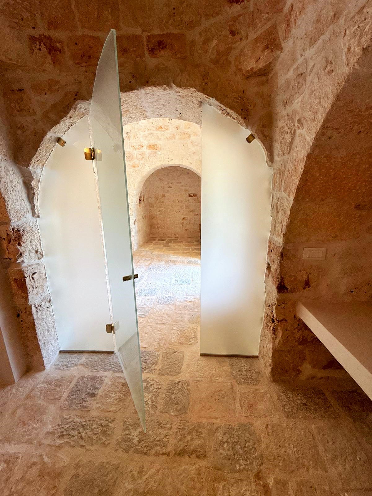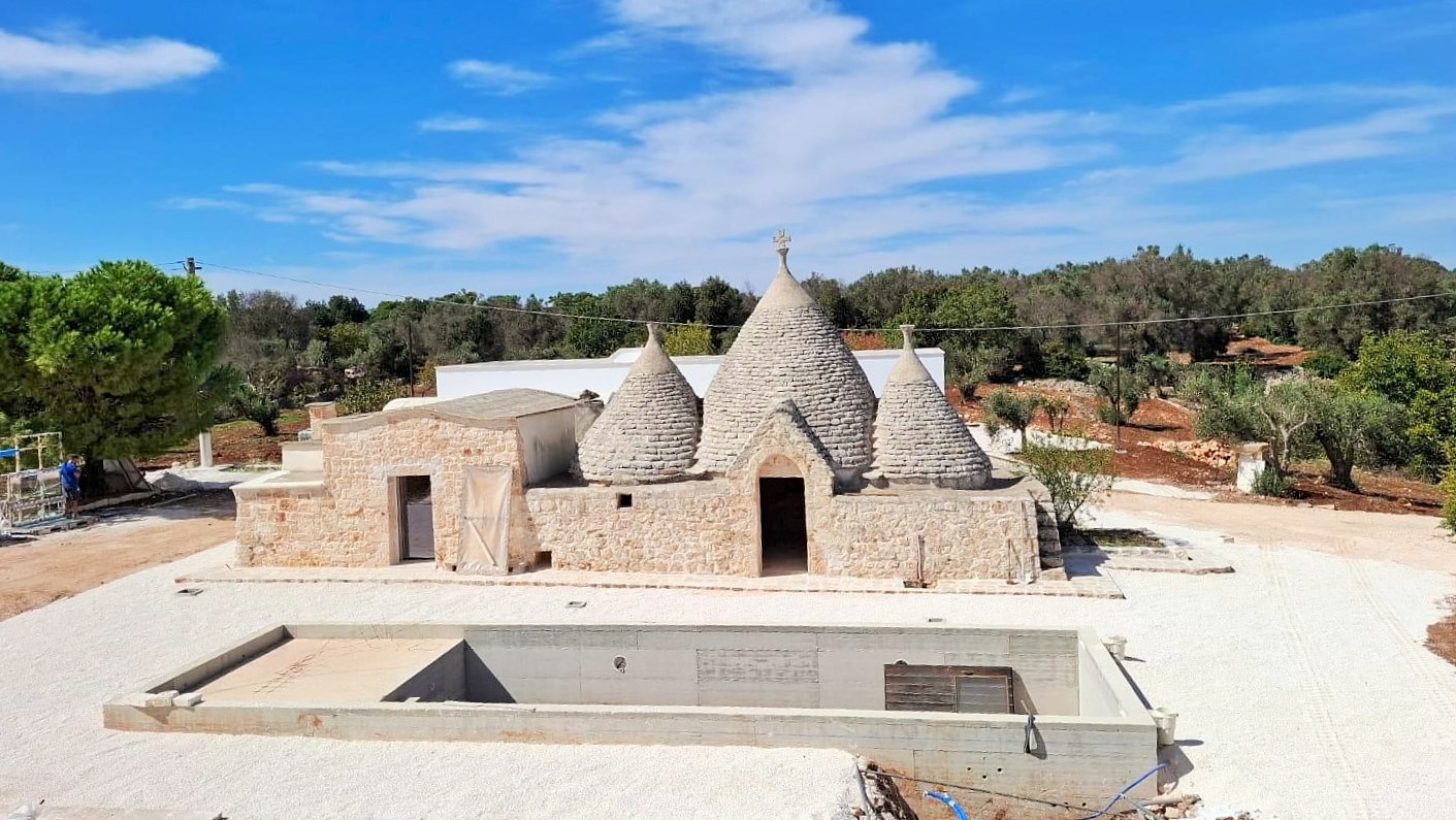 The renovation has enhanced the original architectural features, such as barrel vaults and the typical conical roofs of the trulli, with finishes that highlight the authenticity of the structure.