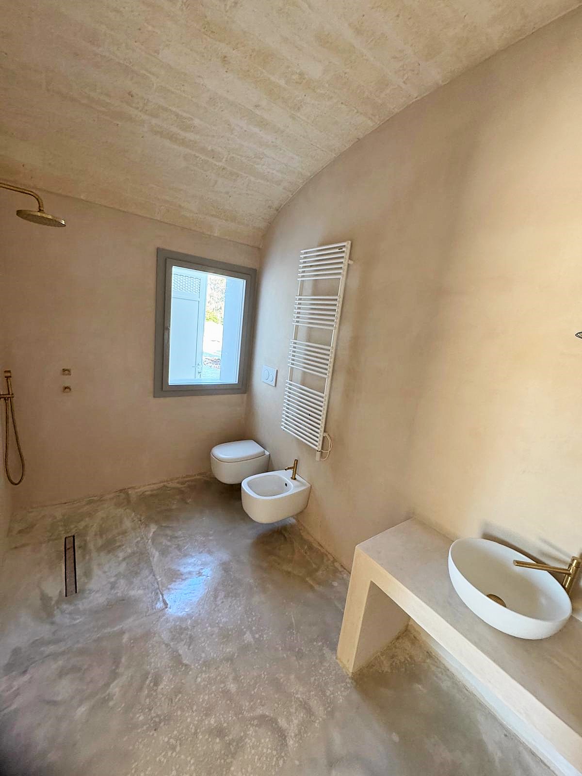 Outside, the property is enhanced by a beautiful 4 x 10 m saltwater skimmer swimming pool in microcement with a shallow “beach” area, whose color can be chosen according to the client’s preference, and with provision for hot water. There is also an outdoor shower, an elegant pergola with a 7.5 x 4 m outdoor kitchen, and a comfortable parking area shaded by two majestic olive trees.
